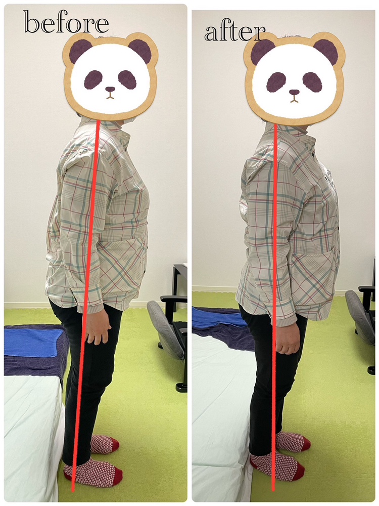腰の痛みにお悩みだったお客様の写真です。施術前は身体のバランスが崩れています。ですが施術後、姿勢がまっすぐになりました。お客様からは「痛みが軽減しました!」という、うれしいお声をいただいています。